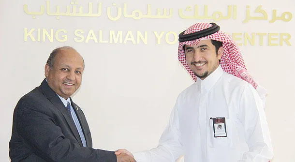 هاني المقبل المدير التنفيدي لمركز الملك سلمان للشباب مع الممثل المقيم لبرنامج الأمم المتحدة الإنمائي («الشرق الأوسط»)