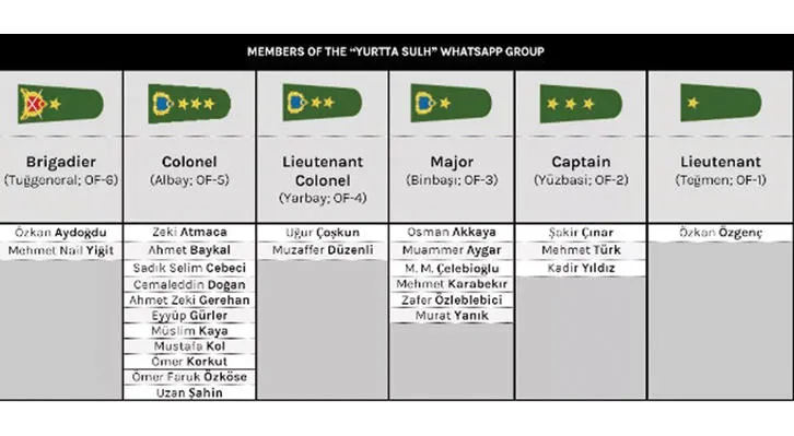 وتتألف مجموعة «واتساب» المشار إليها من كبار المسؤولين العسكريين البارزين، ينتمي أغلبيتهم إلى القوات البرية التركية، ومن بينهم اثنان من القادة برتبة لواء وأحد عشر عقيدا.