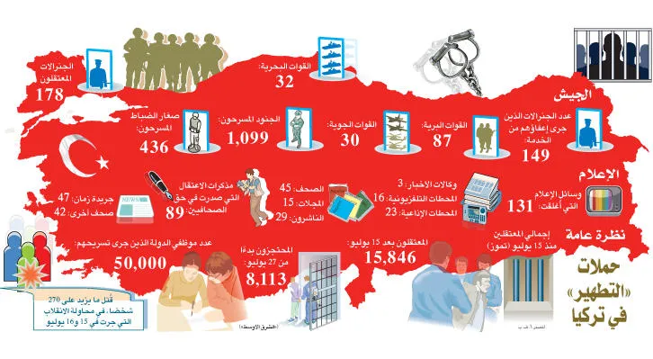 وسرحت السلطات التركية أو أوقفت عن العمل أو بدأت تحقيقات مع عشرات الآلاف في مؤسسات الدولة بما في ذلك الوزارات والقوات المسلحة والشرطة للاشتباه بوجود صلات تربطهم بغولن وحركته.