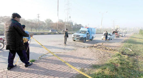 الشرطة تحقق في موقع الانفجار الذي استهدف موكب مشرف بمدينة روالبندي أمس (رويترز)