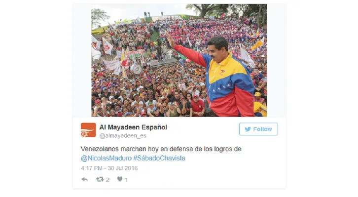 فقد لاحظ متابعو مواقع التواصل الاجتماعي، أخيرا، قيام فضائيات عربية، مثل قناة «الميادين» الإخبارية، بحملة إعلامية باللغة الإسبانية تصب في مصلحة الرئيس الفنزويلي نيكولاس مادورو، أو لترويج أفكار الرئيس السابق هوغو تشافيز، وذلك عبر نشر أخبار باللغة الإسبانية تابعة للدول الحلفاء والناطقة باللغة الإسبانية، أو إعادة نشر الأخبار والمحتويات عبر مواقع التواصل الاجتماعي، مثل «تويتر».