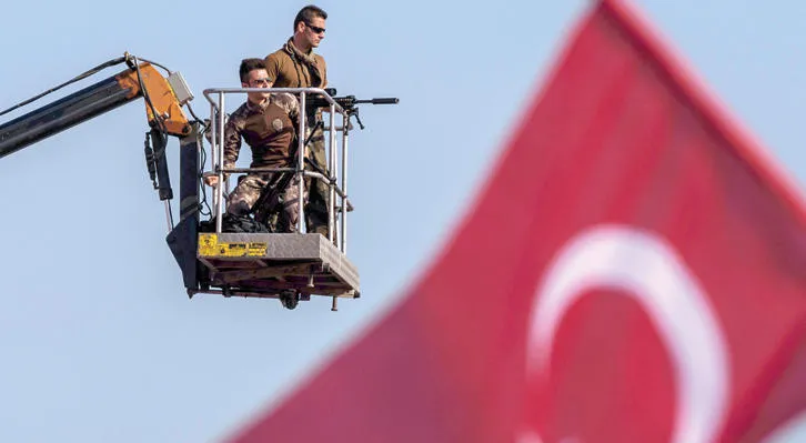 قوات خاصة تركية تراقب الحشود في تجمع «الديمقراطية والشهداء» في ميدان يتي كابي في إسطنبول حيث تجمع الآلاف للتنديد بالانقلاب الفاشل (أ.ف.ب)