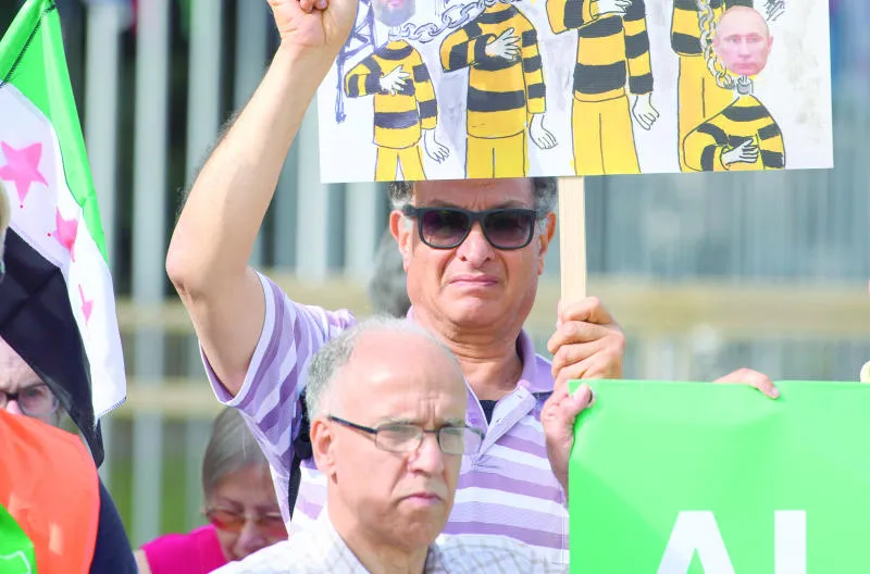 متظاهرون أمام مقر الأمم المتحدة في جنيف الجمعة الماضية للمطالبة بوقف استهداف حلب بالبراميل المتفجرة (أ.ب)