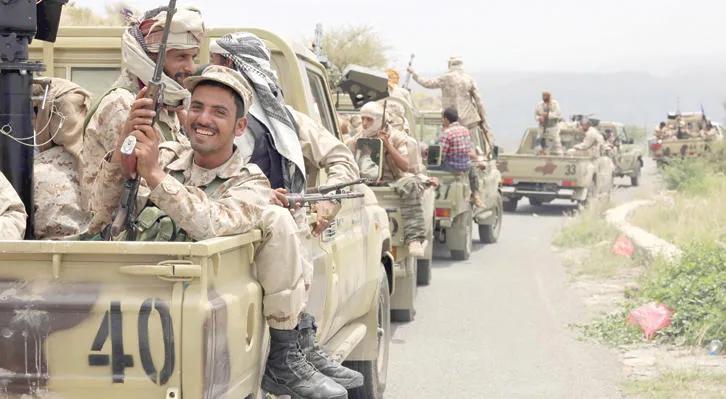جنود يمنيون من قوات الشرعية بكامل أسلحتهم وعتادهم شمال مدينة عدن أمس (أ.ف.ب)