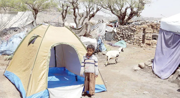 طفل يمني يقف في مخيم للنازحين في محافظة عمران شمال البلاد أمس (إ.ب.أ)