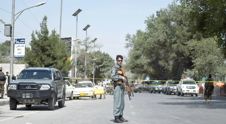 انتشار أمني بالقرب من السفارة الأميركية في حي وزير أكبر خان بالعاصمة كابل بعد تفجير سيارة مفخخة بالقرب منها أمس (أ.ف.ب)