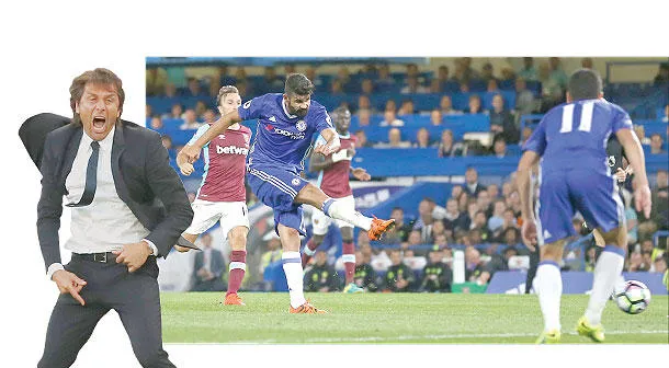 وبعد معاناة تشيلسي أمام وستهام في أول ربع ساعة بدأ فريق كونتي يسيطر على المباراة بشكل تدريجي. وتقدم إيدن هازارد - الذي تعرض لصيحات استهجان الموسم الماضي بسبب انخفاض مستواه بشكل حاد - بهدف لتشيلسي في بداية الشوط الثاني من ركلة جزاء احتسبت بعد خطأ لزميله سيزار أزبيليكويتا. وسيطر تشيلسي على الشوط الثاني وظهر مدى تأثير هازارد إضافة إلى الوافد الجديد نغولو كانتي في وسط الملعب. لكن تشيلسي دفع ثمن عدم ترجمة السيطرة إلى أهداف عندما أدرك جيمس كولينز التعادل لوستهام في الدقيقة 78. واستعاد دييغو كوستا، مهاجم إسبانيا، ذكريات تألقه مع تشيلسي، وسجل هدف الانتصار في الدقيقة الأخيرة بعدما تلقى تمريرة بضربة رأس من الوافد الجديد والبديل ميشي باتشواي. وقال كونتي: «أنا سعيد جدا باللاعبين وبمساهماتهم الكبيرة».