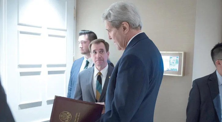 وزير الخارجية جون كيري مع المتحدث باسم الخارجية الأميركية جون كيربي، في أكتوبر 2015 («نيويورك تايمز»)
