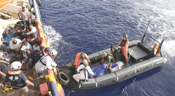 عناصر من {الصليب الأحمر} الإيطالي ينتشلون أجساد أمرأة ورجل وطفلين طافية على المياه بين مالطا وليبيا أول من أمس (إ.ب.أ)