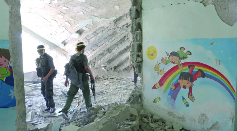 مقاتلان في فيلق الرحمن الفصيل الاسلامي المعارض في ريف دمشق، يشاركان بمعركة ضد قوات النظام في بلدة جوبر، امس (غيتي)