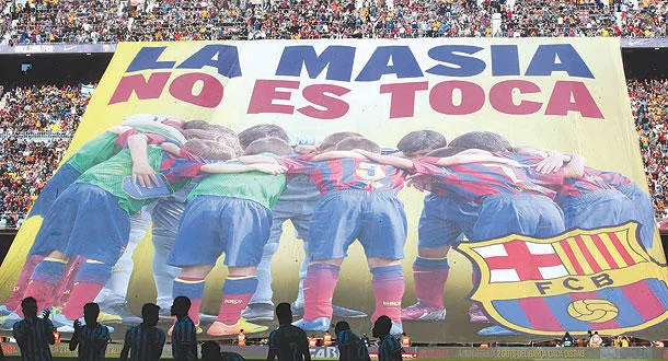 جماهير برشلونة حملت لافته {لا مساس بمدرسة الناشئين} ردا على عقوبات الفيفا (رويترز)