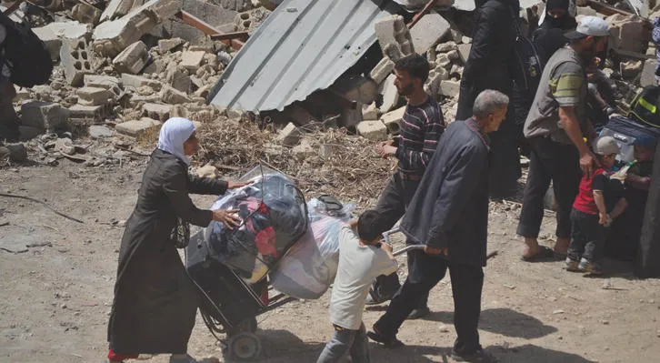 إحدى عائلات داريا المنكوبة، بكبارها وصغارها، حملت حوائجها وبدأت رحلة التهجير (إ.ب.أ)