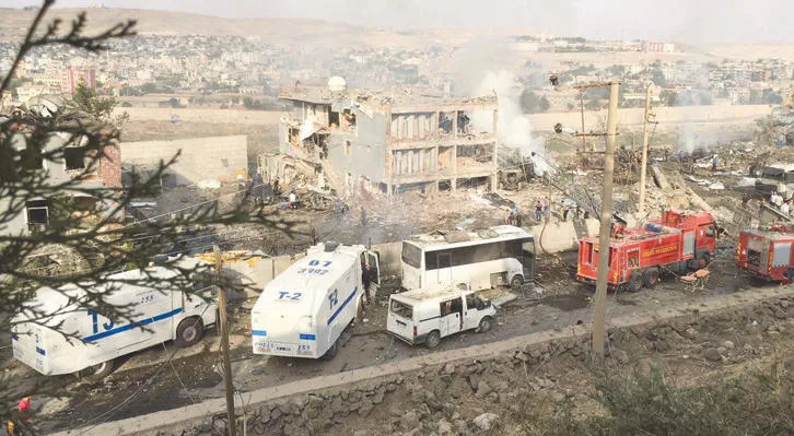 سيارات الدفاع المدني والشرطة التركية تقف بالقرب من مقر الشرطة المدمر بعد أن استهدف بسيارة مفخخة أمس (أ.ف.ب)