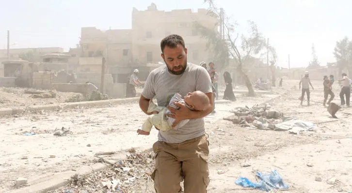 سوري يحمل رضيعا في حي المعادي بحلب بعد قصفه بالبراميل المتفجرة من قبل طائرات النظام أمس (أ.ف.ب)