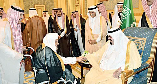 الملك عبد الله بن عبد العزيز يصافح مستقبليه لدى وصوله إلى الرياض أمس حيث كان في استقباله الأمير سلمان بن عبد العزيز والأمراء وجمع من المسؤولين (واس)