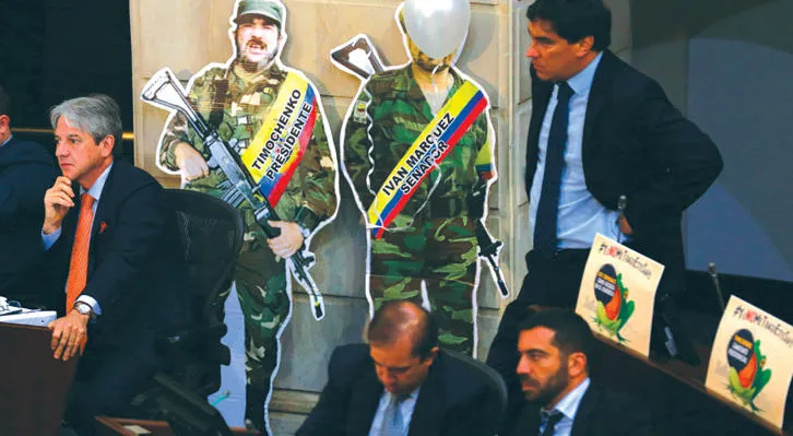 صورة أرشيفية لأعضاء مجلس الشيوخ الكولومبي يناقشون ما بعد الصراع وخلفهم صور لزعماء حركات التمرد السابقين في الكونغرس