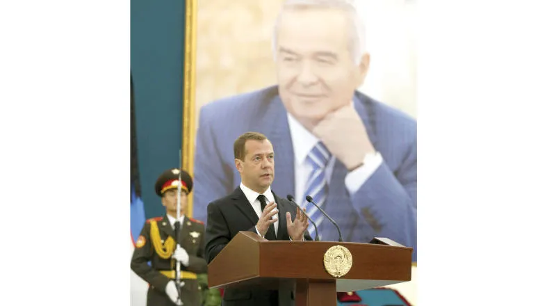 موسكو أول المعزين.. رئيس الوزراء الروسي ديميتري ميدفيديف في سمرقند يلقي كلمة تأبينية في الرئيس كريموف (رويترز)