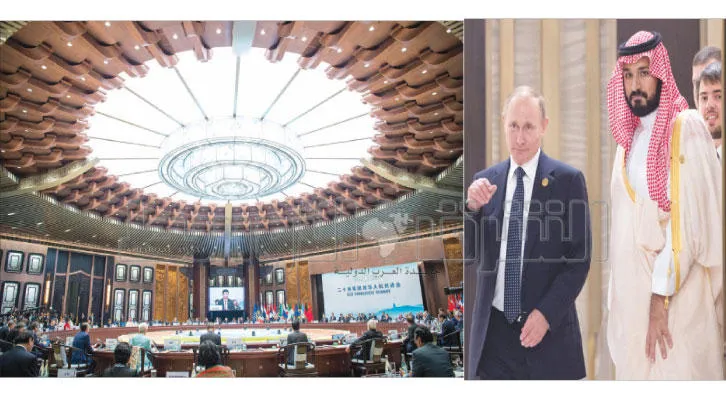 الأمير محمد بن سلمان خلال لقائه الرئيس الروسي أمس .. وجانب من الجلسة الافتتاحية لقمة مجموعة العشرين في هانغتشو بالصين (تصوير: بندر الجلعود)