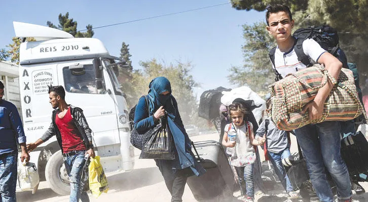 نازحون سوريون عند معبر كركميش الحدودي التركي عادوا أمس إلى بلدتهم جرابلس شمال سوريا (أ.ف.ب)