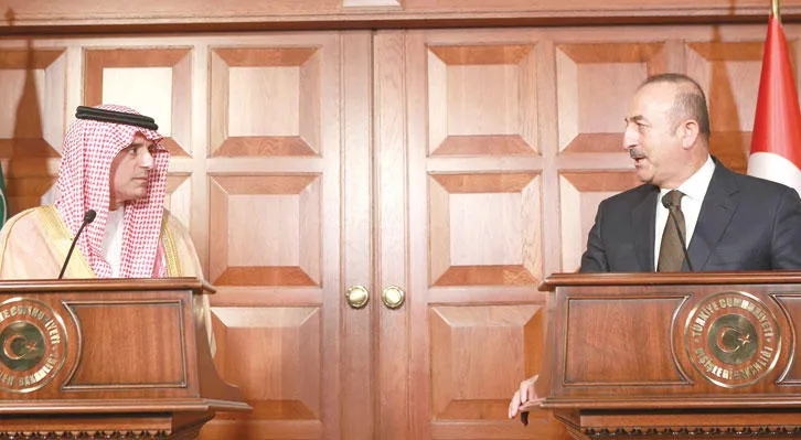 وزير الخارجية السعودي عادل الجبير خلال مؤتمر صحافي مع نظيره التركي مولود جاويش أوغلو في أنقرة أمس (أ.ف.ب)