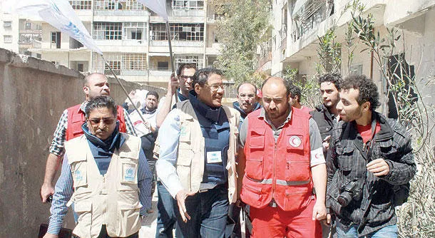 موظفون في الهلال الأحمر السوري والمفوضية السامية لشؤون اللاجئين التابعة للأمم المتحدة يدخلون، أمس، منطقة بستان القصر في حلب، بعد موافقة قوات الحكومة والمعارضة على وقف إطلاق النار لإدخال مساعدات (أ.ف.ب)