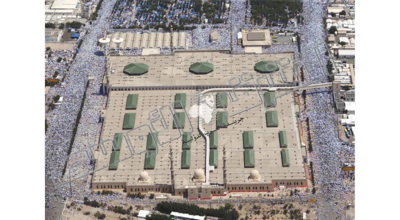 مسجد نمرة وتبدو كثافة الحجاج حوله لحظة وجودهم في مشعر عرفة (تصوير: احمد حشاد)