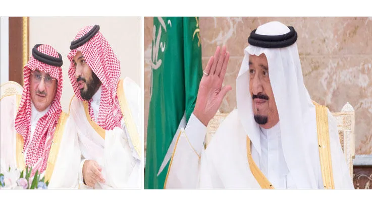 الملك سلمان لدى استقباله المهنئين بعيد الأضحى المبارك وقادة القطاعات العسكرية المشاركة بالحج في منى أمس (واس) - حديث بين ولي العهد وولي ولي العهد خلال مراسم الاستقبال (واس)