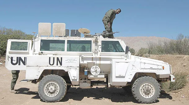 عنصر من قوات حفظ السلام التابعة للأمم المتحدة يقف على سيارته ويراقب الحدود مع سوريا بالقرب من قرية مجدل شمس في القطاع الذي تحتله إسرائيل من هضبة الجولان (أ.ف.ب)