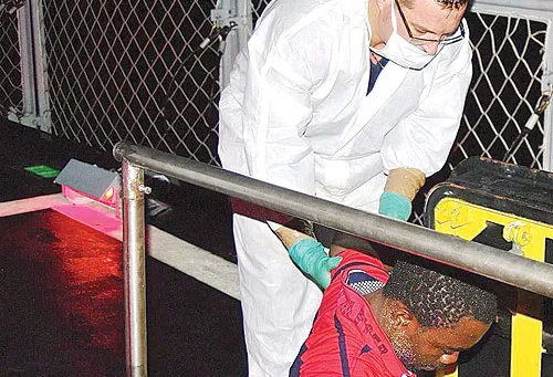 انزال احد المهاجرين الذين جرى انقاذهم في جزيرة لامبيدوزا في ايطاليا في ساعة مبكرة من صباح أمس (إ.ب. ا)