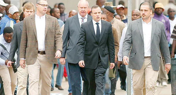 بيستوريوس مع فريق الدفاع أثناء وصولهم لمبنى المحكمة في بريتوريا (رويترز)