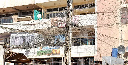 أسلاك كهربائية تتدلى في حي الكرادة (داخل) وسط بغداد لتوصيل الطاقة إلى البيوت بأسعار عالية («الشرق الأوسط»)