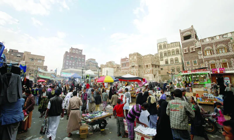 متسوقون يشترون بضائع من سوق شعبية تطل على المدينة القديمة في صنعاء (رويترز)