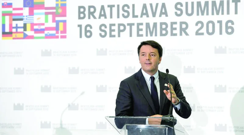 رئيس الوزراء الإيطالي ماتيو رينزي في مؤتمر صحافي بعد قمة براتيسلافا مساء أول من أمس (رويترز)