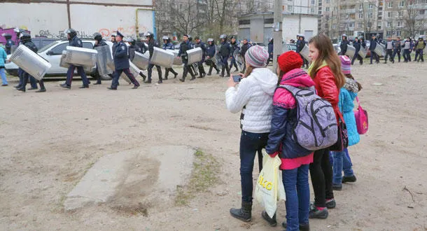 تلميذات يشاهدن عناصر من الشرطة تتقدم في حي كييف بمدينة خاركيف الواقعة شرق أوكرانيا أمس (إ.ب.أ)