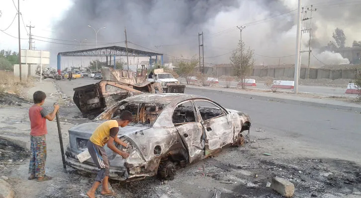 فتيان يلعبان قرب حطام سيارة وسط الموصل (رويترز)