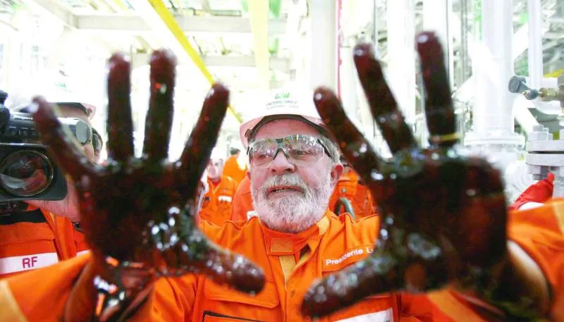 الرئيس لولا دا سيلفا يظهر ويداه مغطاتان بالزيت خلال افتتاح منصة مجموعة بتروبراس النفطية العملاقة (إ.ب.أ)