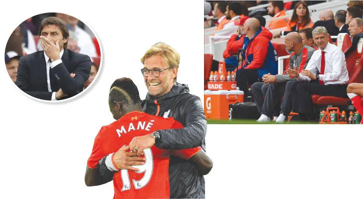 فينغر يجلس منتشيًا على مقاعد بدلاء آرسنال وهو يتابع انتصار فريقه على تشيلسي (أ.ف.ب) - كونتي مصدوم من مستوى لاعبي تشيلسي (أ.ب) - كلوب مدرب ليفربول يشارك مهاجمه ماني الاحتفال (أ.ف.ب)