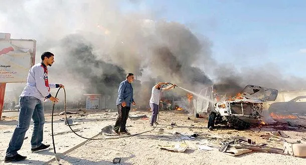 ليبيون يطفئون نيرانا اشتعلت في سيارة مفخخة بعد تفجيرها بجوار مركز انتخابي في بنغازي أمس (رويترز)