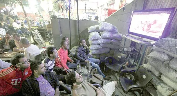مواطنون مصريون في وسط القاهرة ليلة أول من أمس يتابعون حلقة جديدة من برنامج «البرنامج» تقديم الإعلامي الساخر باسم يوسف (رويترز)