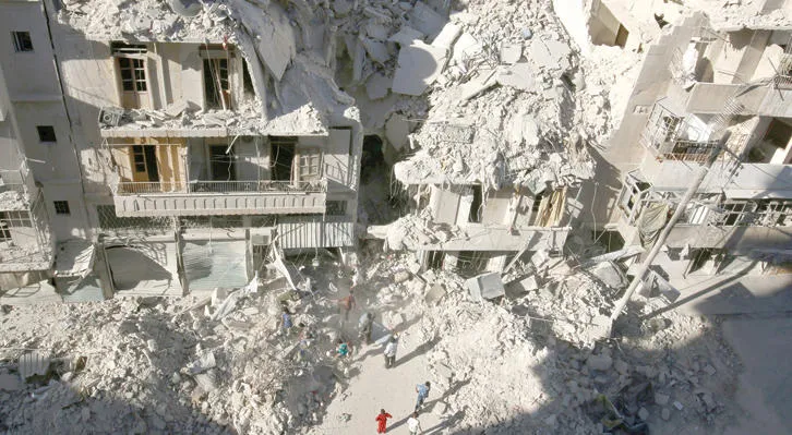 سكان حي طريق الباب في مدينة حلب، يحفرون تحت الأنقاض في بحث مستمر عن ناجين في موقع ضرب بغارة جوية من الطيران الروسي والأسدي أول من أمس (رويترز)