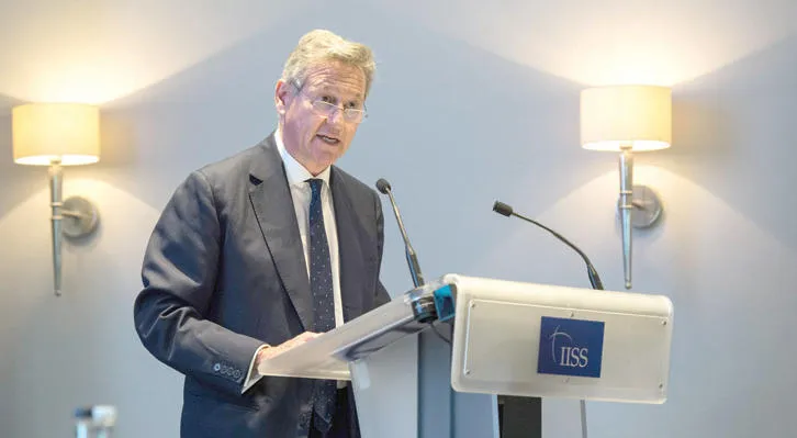 د. جون شيبمان المدير العام والرئيس التنفيذي للمعهد الدولي للدراسات الاستراتيجية يلقي كلمته في مقر المعهد بلندن أمس خلال استعراض التقرير السنوي الذي أعده مجموعة من الخبراء والمختصين عن أحداث عام 2016 (أ.ف.ب)