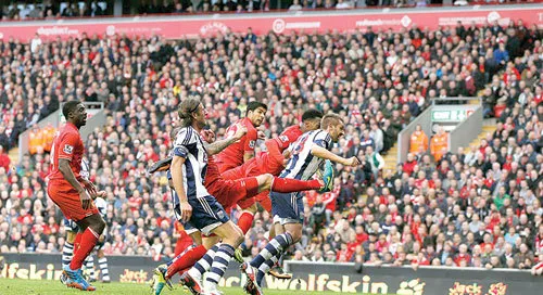 وأضاف سواريز الهدف الثاني بضربة رأسية من حافة المنطقة إثر تمريرة عرضية من الفرنسي علي سيسوكو أسكنها مرمى الحارس ميهيل في الدقيقة 17. وأهدر المدافع التشيكي مارتن سكيرتل فرصة التعزيز بالثالث عندما تلقى كرة من القائد ستيفن جيرارد داخل المنطقة ففشل في متابعتها داخل المرمى. وأنقذ سكيرتل مرماه من هدف محقق عندما أبعد كرة الدولي الفرنسي السابق ومهاجم ليفربول سابقا نيكولا أنيلكا من باب المرمى. وحقق سواريز الهاتريك بضربة رأسية من مسافة قريبة إثر ركلة حرة جانبية انبرى لها القائد جيرارد في الدقيقة 54. وردت العارضة تسديدة قوية لدانيال ستوريدج في الدقيقة 58. وحصل الضيوف على ركلة جزاء إثر عرقلة بيلي جونز داخل المنطقة من قبل البرازيلي لوكالس ليفا والفرنسي مامادو ساكو، فانبرى لها موريسون بقوة داخل المرمى في الدقيقة 66. وأعاد ستوريدج الفارق إلى سابق عهده بتسديدة ساقطة مميزة من خارج المنطقة في الدقيقة 79. وثأر ليفربول لخسارتيه ذهابا وايابا أمام وست بروميتش ألبيون الموسم الماضي.