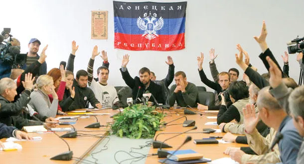 ناشطون موالون لروسيا يصوتون في مبنى حكومي احتلوه بمدينة دونيستك الواقعة شرق أوكرانيا أمس، وذلك بعد إعلانهم من جانب واحد عن تشكيل {جمهورية دونيتسك} (أ.ب)