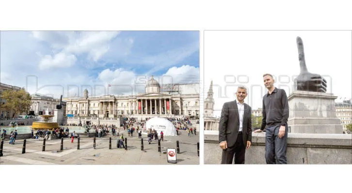 عمدة لندن صديق خان يحضر حفل إطلاق التمثال الجديد للفنان ديفيد شريغلي في ميدان الطرف الأغر أمس (تصوير: جيمس حنا) - ميدان «ترافلغر سكوير» شيد عام 1840 لإحياء ذكرى معركة تاريخية