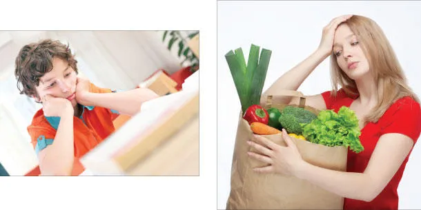 وعلى سبيل المثال، فإن نقص فيتامين «بي1» قد يُؤدي إلى الصداع وعصبيَّة المزاج وعدم القدرة على التركيز والإرهاق وأنواع أخرى من الاضطرابات العصبيَّة. كما قد يُسبب نقص فيتامين «بي2» إجهادَ العين والصداع، وثمة مؤشرات علمية على أن توفير هذا الفيتامين للجسم يُسهم في الاسترخاء ويقضي على الأرق والصداع الناجم عن التوتُّر. وكذا الحال مع قائمة طويلة من الفيتامينات الأخرى وقائمة مماثلة من المعادن كالحديد والزنك والفسفور والمغنيسيوم والبوتاسيوم وعناصر غذائية أخرى كالكافيين ودهون «أوميغا3».