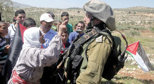 فلسطينية تتحدى جندياً اسرائيلياً أثناء اعتصام لفلسطينيين ضد مصادرة أراض لهم في شرق نابلس امس (أ.ف.ب)