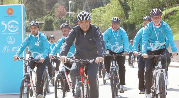 الرئيس التركي عبد الله غل يقود دراجته الهوائية أمس إيذانا ببدء جولة الدراجات الهوائية حول تركيا برعاية الرئاسة (أ.ف.ب)