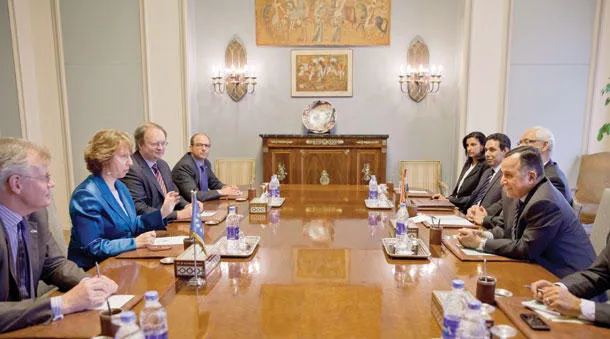 كاثرين اشتون ووزير الخارجية نبيل فهمي خلال اجتماع عقد في مقر وزارة الخارجية المصرية (أ.ف.ب)