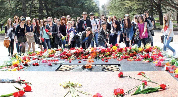 طلاب يضعون ورودا أمام قبر الجندي المجهول في سيمفيروبول عاصمة القرم بمناسبة إحياء الذكرى الـ70 لتحرير شبه الجزيرة من النازية (أ.ف.ب)