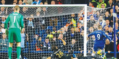 توريس نجم تشيلسي رقم 9 يسجل في شباك سيتي مستغلا الخروج الخاطئ للحارس هارت وارتباك الدفاع (أ.ب)